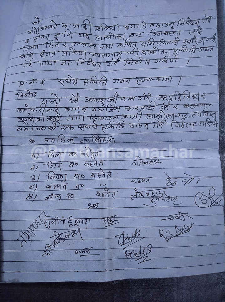 नक्कली हस्ताक्षर, अवास्तविक उपभोक्ता र घरघरमा गएर हस्ताक्षर गरि समिति बनाएको भन्दै स्थानीयले गाउँपालिकामा समिति खारेजी गर्न र कारबाही गर्न माग गरेका छन् । निवेदनमा जिल्ला प्रशासन कार्यालय प्यूठान र अख्तियार दुरुपयोग अनुसन्धान आयोग कोहलपुरलाई समेत बोद्यार्थ दिइएको छ ।