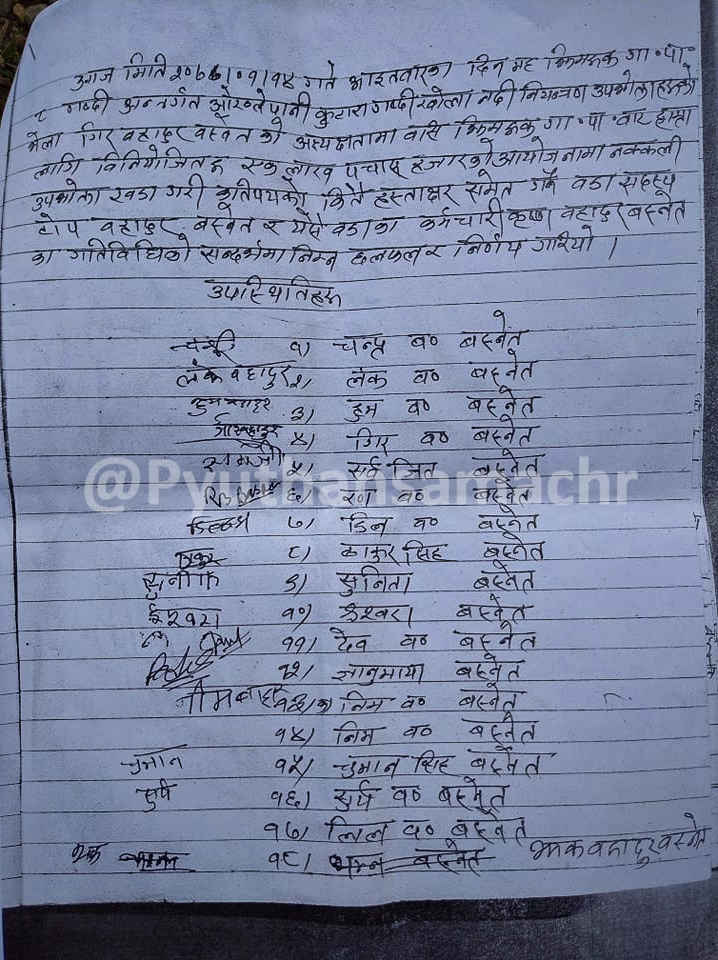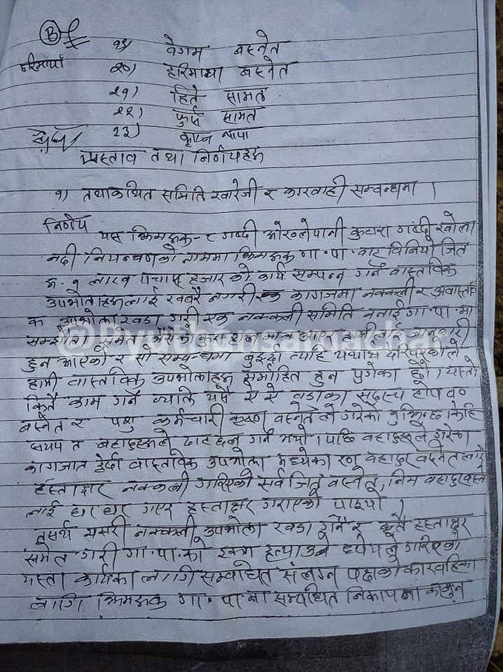गाउँपालिकाले नदि नियन्त्रणका लागि एक लाख ५० हजार विनियोजन गरको थियो । गाउँमा योजना परेपछि उपभोक्ता समिति गठन गर्नका लागि पालिकामा बुझ्न जाँदा उक्त कुरा थाहा भएको स्थानीय विस्नु बस्नेतले बताउनुभयो । फागुन २१ गते समिति गठन गरिसकेका रहेछन, उहाँले भन्नुभयो, हामीले एक हप्ता अगाडी मात्र थाहा पाइम् । कसरी समिति गठन गरेको भनेर सोधपुछ गर्दा हाँक हालेरै बैठक बोलाएर समिति गठन गरेको भन्नुभयो, उहाँले थप्नुभयो, हामीले हाँक हालेको पनि सुनेनौँ । गाउँपालिकाका किर्ते काम कसरी र कस्ले गर्यो भनेर निवेदन दिएका छौं, उहाँले भन्नुभयो, गाउँपालिकाले गर्ला अब के गर्ने हो ।