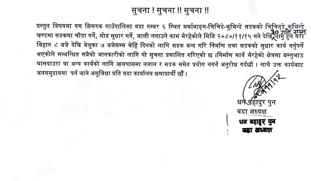 आजदेखि फागुन ३० गतेसम्म सडक बन्द हुने वडा अध्यक्ष धनबहादुर पुनले जानकारी दिनुभयो । सडक चौडा गर्ने, मोड सुधार गर्ने, जाली लगाउने कामको लागि सडक बन्द गर्नुपर्ने भएको उहाँले बताउनुभयो ।