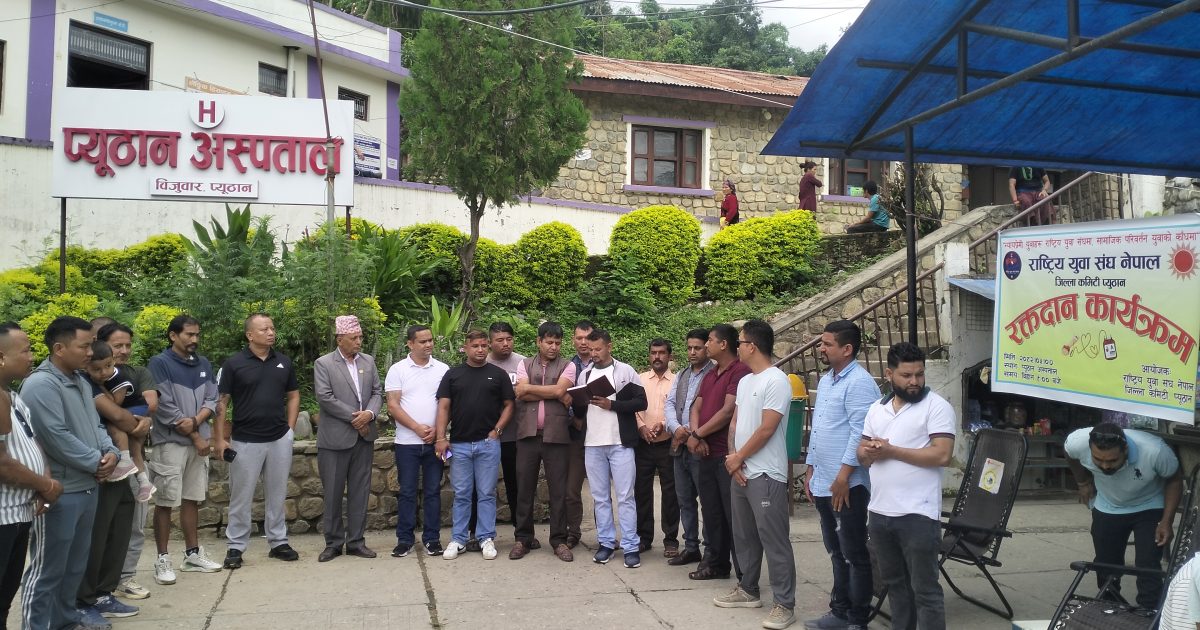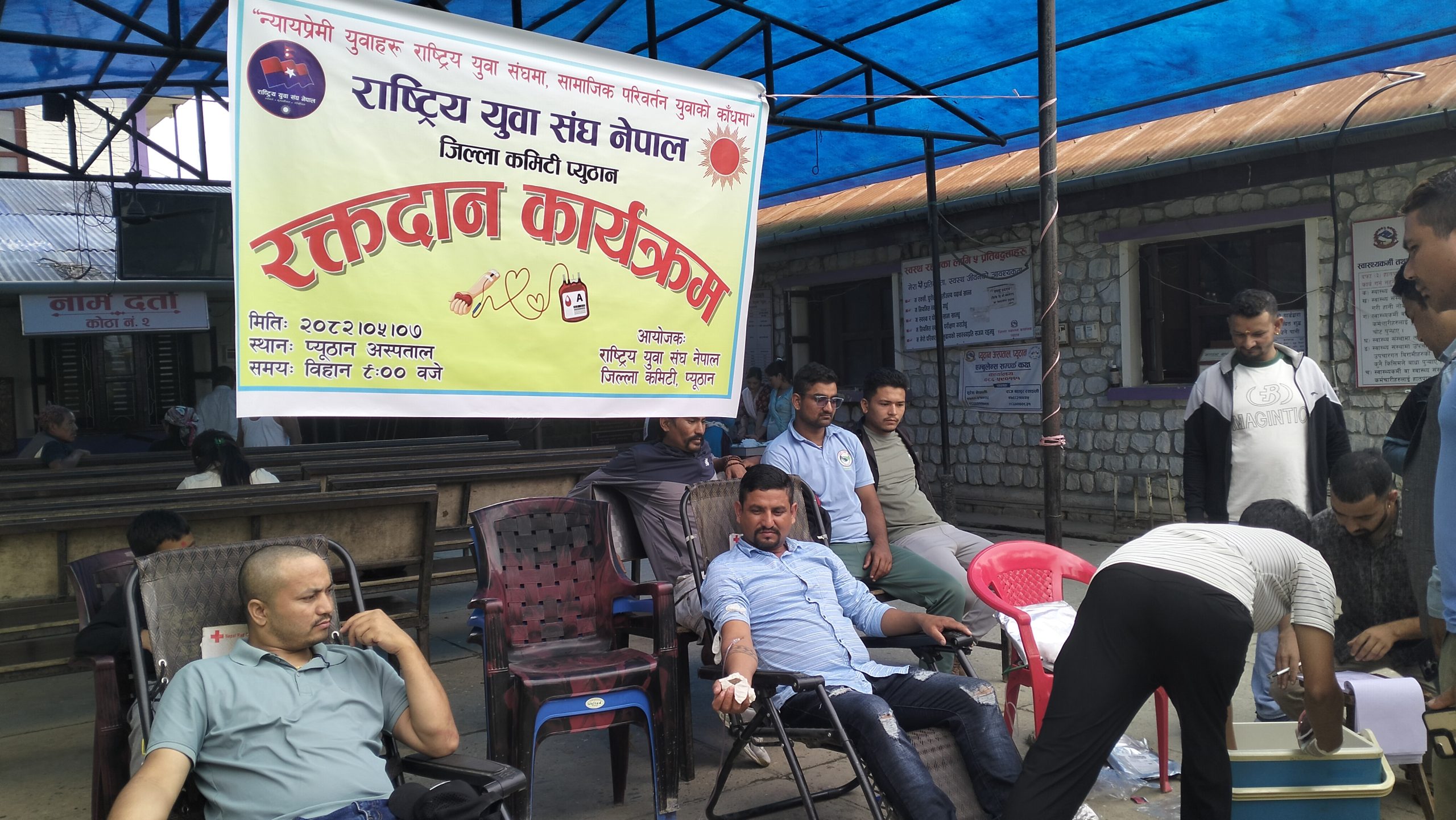 प्यूठान । राष्ट्रिय युवा संघ नेपाल प्यूठानले रक्तदान कार्यक्रम सम्पन्न गरेको छ । रक्त संचार केन्द्र प्यूठानको ब्यबस्थापनमा जिल्ला अस्पतालमा रक्तदान कार्यक्रम गरिएको हो ।
