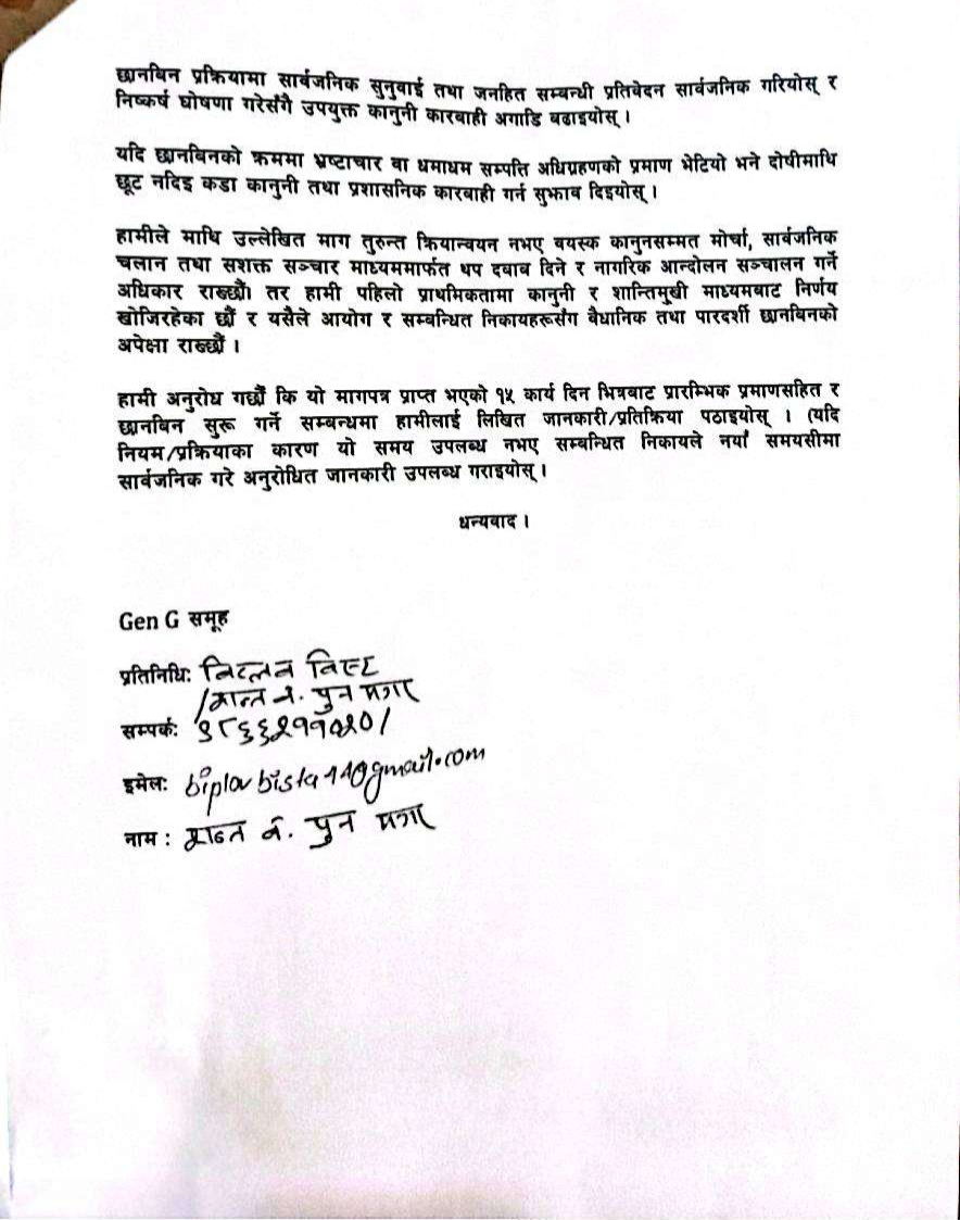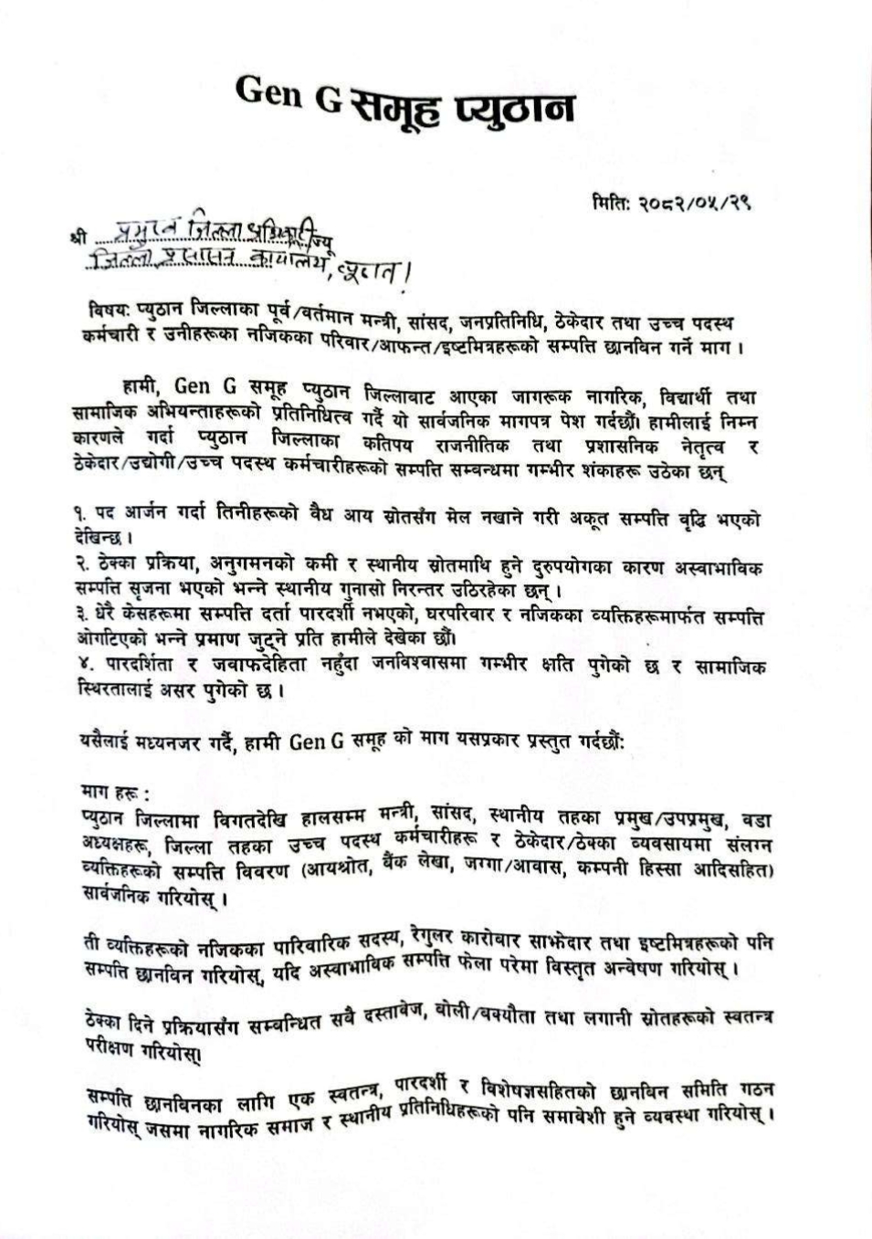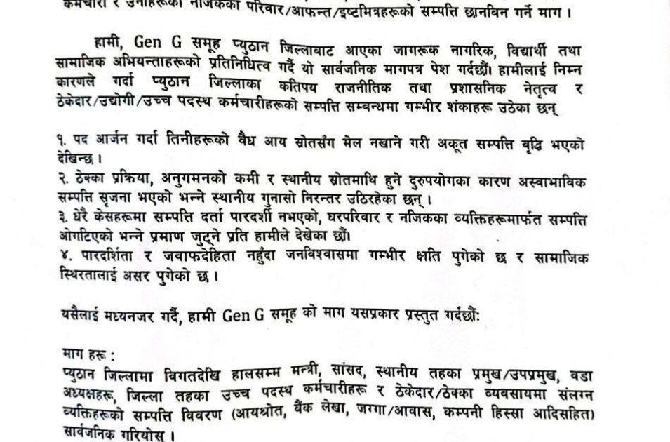 प्यूठान । जेनजी समुह प्यूठानले जनप्रतिनिधि, उच्च पदस्थ कर्मचारी, ठेकेदार र उनका आफन्तहरुको सम्पत्ती छानविन गर्न माग गरेको छ । प्रमुख जिल्ला अधिकारी समक्ष माग गर्दै १५ दिन भित्र छानविन सुरु भएको लिखित जानकारी गराउन समुहले माग गरेको छ ।