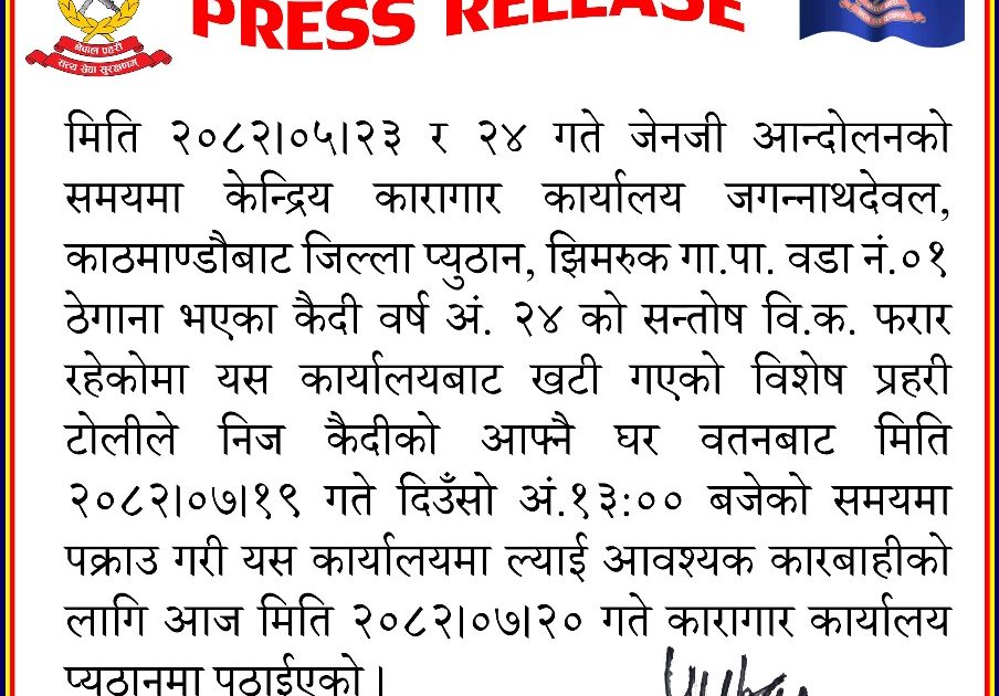 प्यूठान । गत भदौं २३ र २४ गते भएको जेनजी आन्दोलनको समयमा केन्दिय कारागार काठमाण्डौंबाट फारर रहेका एक कैदीबन्दीलाई प्यूठान प्रहरीले पक्राउ गरेको छ ।