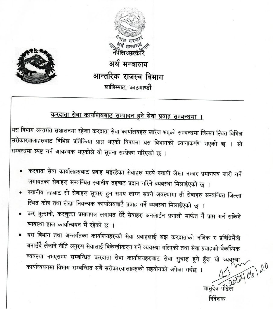 करदाता सेवा कार्यालयहरूबाट प्रवाह भइरहेका सेवाहरू मध्ये स्थायी लेखा नम्बर प्रमाणपत्र जारी गर्ने लगायतका सेवाहरू सम्बन्धित स्थानीय तहबाट प्रदान गरिने व्यवस्था मिलाइएको हो । तत्कालै स्थानीय तहबाट सो सेवाहरू सुचारु हुन समय लाग्न सक्ने अवस्थामा ती सेवाहरू सम्बन्धित जिल्ला स्थित कोष तथा लेखा नियन्त्रक कार्यालयबाटै प्रवाह गर्ने व्यवस्था मिलाइएको विभागका निर्देशक वासुदेव पौडेलले जानकारी दिनुभयो ।