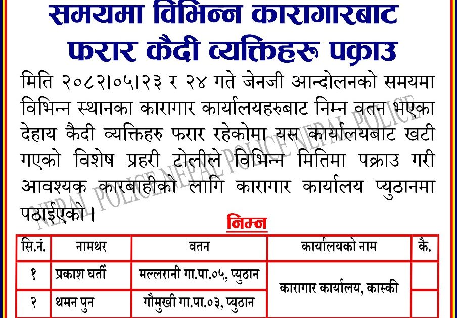प्रकाश र थमन कास्की कारागार, जीवा र नारायणी केन्द्रिय कारागार जगन्नाथदेवल काठमाडौबाट फरार रहेको जिल्ला प्रहरी कार्यालय प्यूठानका सूचना अधिकारी प्रहरी निरीक्षक युवन कुमार चौधरीले जानकारी दिनुभयो ।