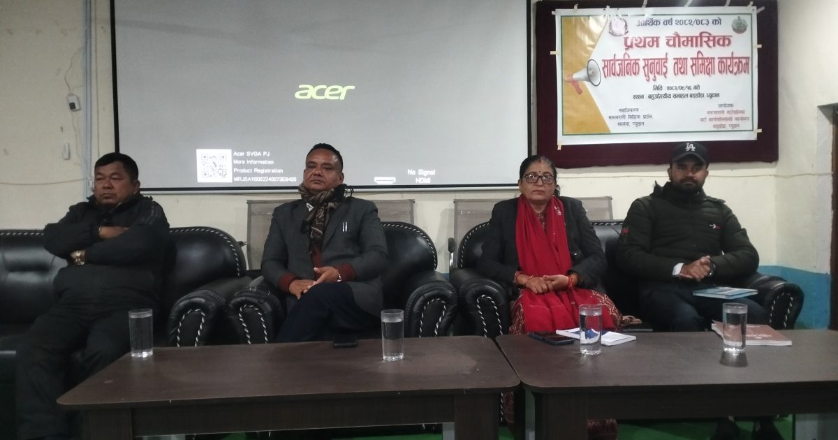 प्यूठान । सरुमारानी गाउँपालिकाले चालु आर्थिक वर्ष २०८२।०८३ को प्रथम चौमासिकको सार्वजनिक सुनुवाई सम्पन्न गरेको छ । गाउँपालिकाको सभाहल बड्डाँडामा प्रथम चौमासिक प्रगति सार्वजनिक गर्दै सुनुवाई गरिएको हो ।