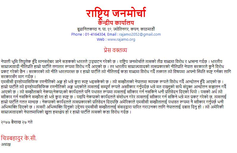 अध्यक्ष चित्र बहादुर केसीले प्रेस वक्तव्य जारी गरि नेपाल सरकारको नीति भारतपरस्त रहेको भन्दै तत्काल यस विषयमा आफ्नो स्थिति स्पष्ट गर्न सरकारसँग माग गरेको छ ।