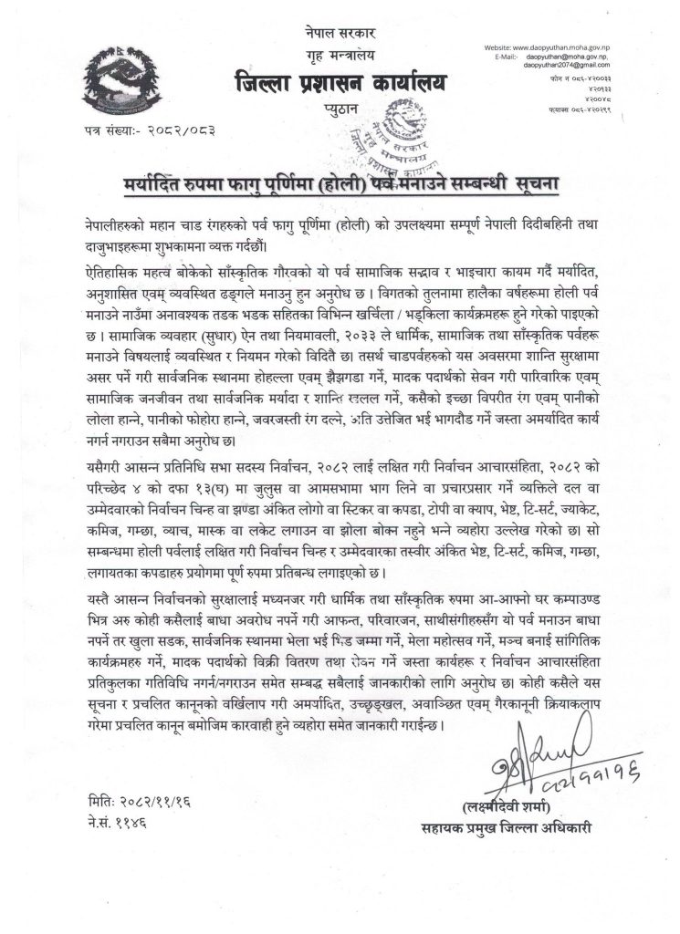 होली पर्वलाई लक्षित गरी निर्वाचन चिन्ह र उम्मेदवारका तस्वीर अंकित भेष्ट, टि–सर्ट, कमिज, गम्छा, लगायतका कपडाहरु प्रयोगमा पूर्ण रुपमा प्रतिबन्ध लगाइएको जिल्ला प्रशासन कार्यालय प्यूठानले जनाएको छ ।