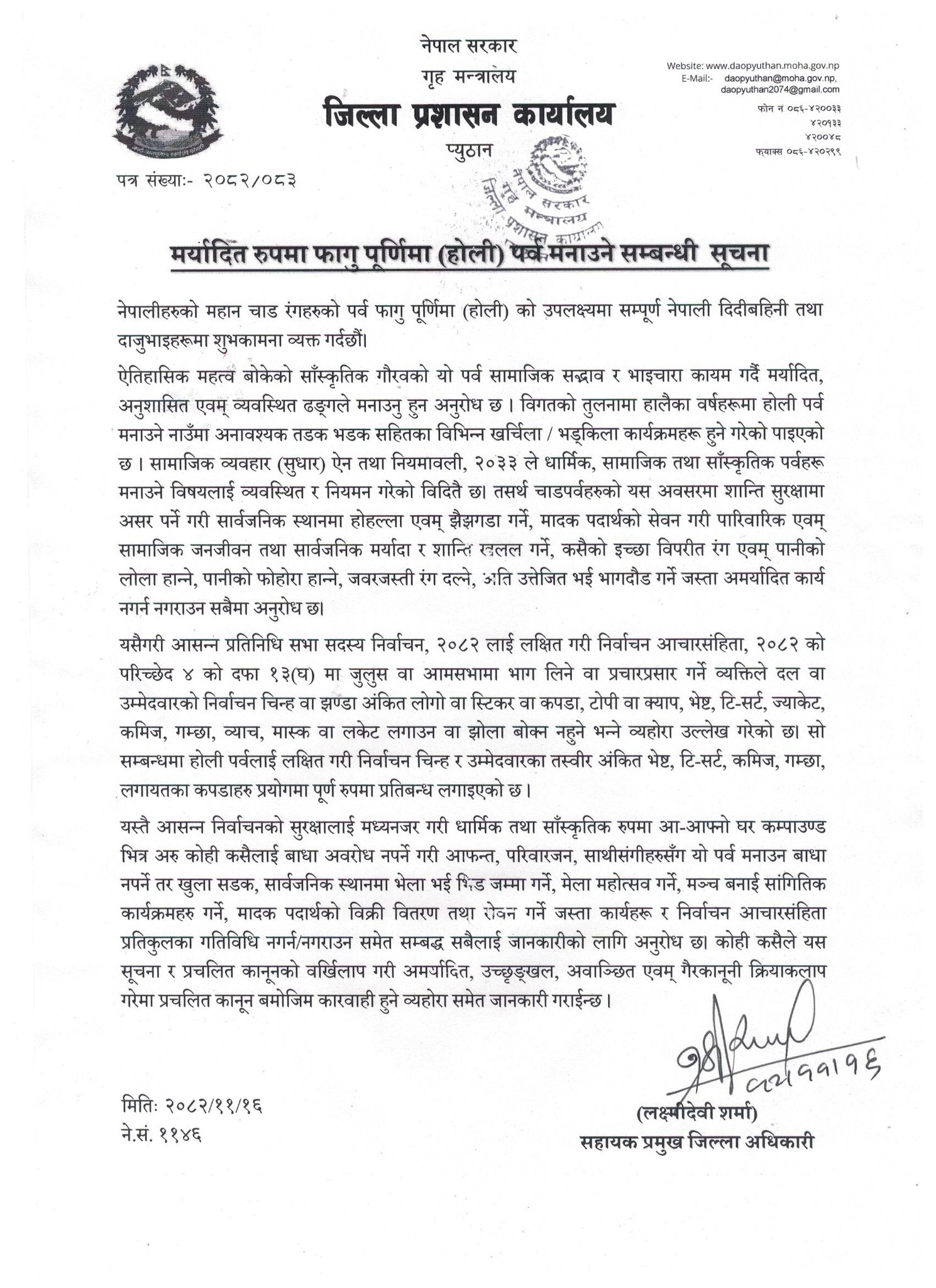 होली पर्व परिवारभित्र मनाउन प्यूठान प्रशासनको आग्रह