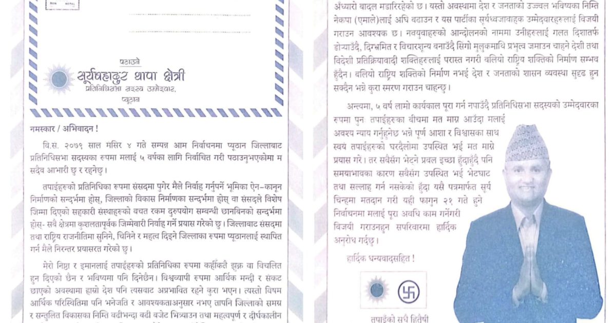 प्यूठान । नेकपा एमालेका उम्मेदवार सूर्य थापाले मतदातालाई चिठी लेख्नुभएको छ । आगामी प्रतिनिधिसभा सदस्य निर्वाचनमा उम्मेदवार बन्नुभएका थापाले आफुलाई मत माग्दै मतदातालाई चिठी लेख्नुभएको हो ।