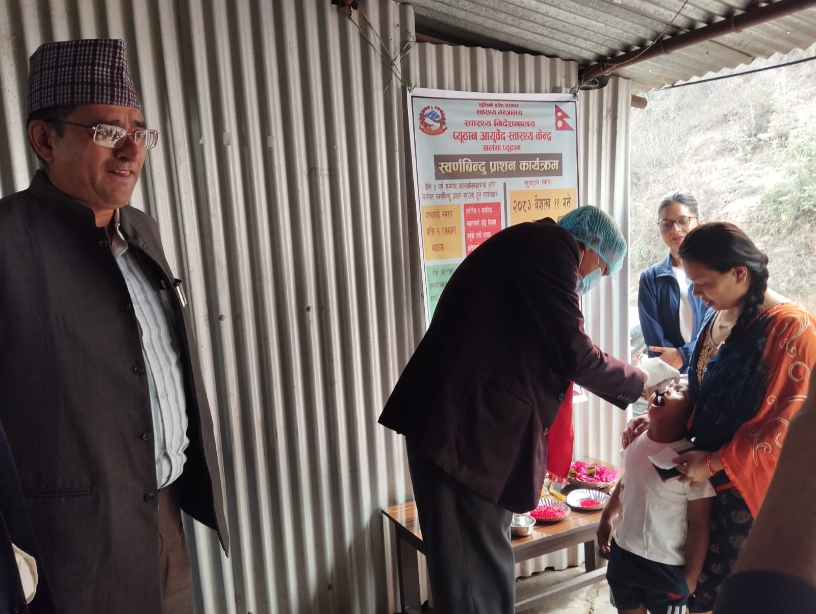 बालबालिकाहरुको सम्पूर्ण शारीरिक तथा मानसिक विकास तथा रोगप्रतिरोधात्मक क्षमता बढाउने स्वर्णबिन्दु थोपा आयुर्वेदिक औषधियुक्त थोपा हो । १ वर्ष देखि ५ वर्ष सम्मका बालबालिकाहरुलाई निःशुल्क स्वर्णबिन्दु थोपा खुवाउने निमित्त प्रमुख रोकाले बताउनुभयो ।