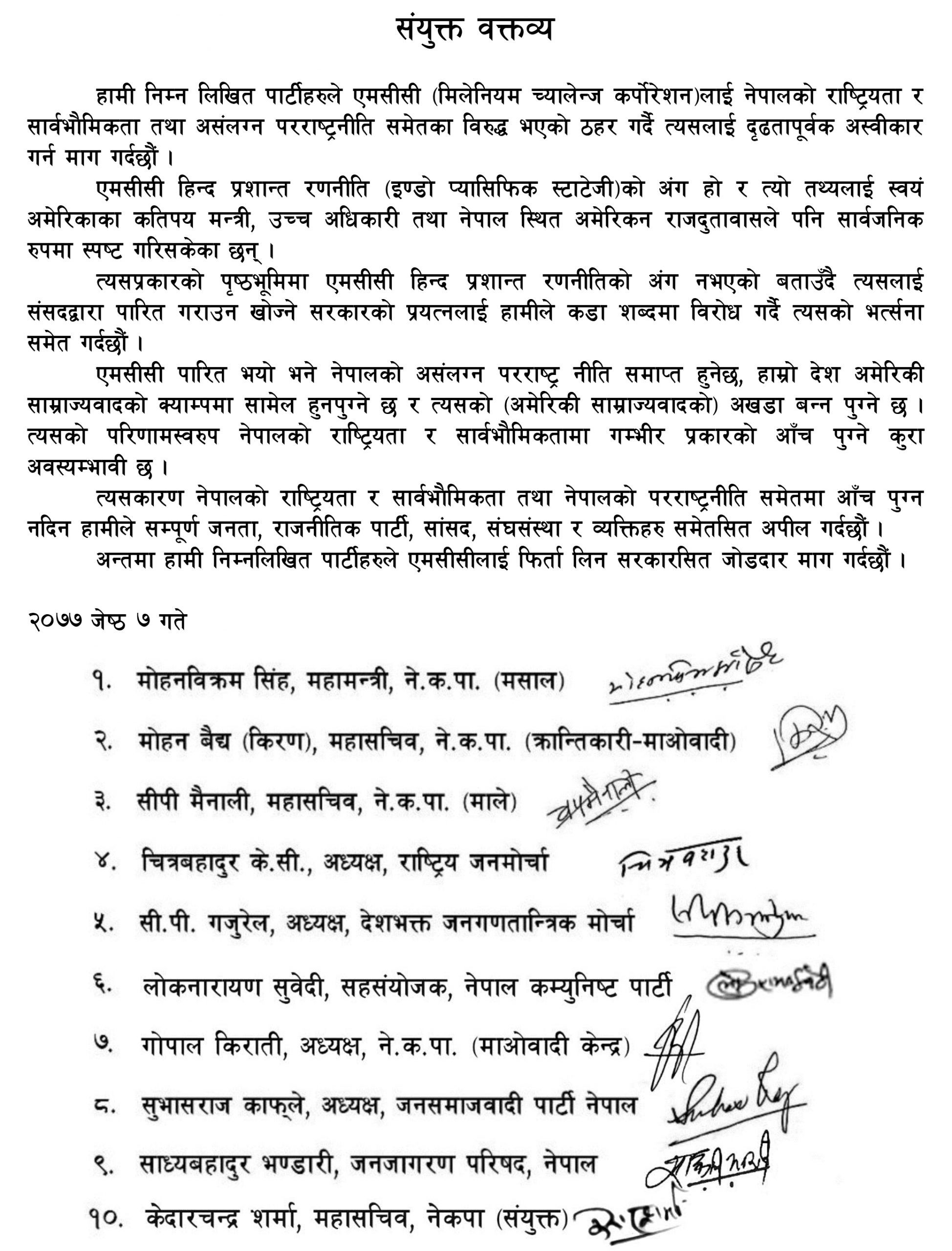 एमसीसी नेपालको राष्ट्रियता र सार्वभौमिकता तथा असंलग्न परराष्ट्रनीति समेतका विरुद्ध भएको ठहर गर्दै त्यसलाई दृढतापूर्वक अस्वीकार गर्न माग गरेका छन् ।