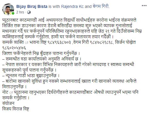सम्पर्क व्यक्तिको रुपमा भावना विष्ट (९८४९६३८७०३), वेगम गिरी (९८४७८२१८१८), सिर्जन पोख्रेल (९८६०२०५४७६) तोकिएको विष्टले जानकारी दिनुभयो । जिल्ला फर्किनेले विभिन्न शर्त पालना गर्नुपर्ने समेत उल्लेख गरिएको छ ।