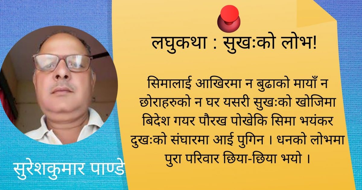 सिमाले कमाएर पठाएको धनले सिमालाई बद्नाम गर्ने र आफुले ऐयासी गर्नमा खर्चियो । अनि अक्षले आर्कि महिँला ल्याएर घर भित्रायो । उसै सँग बस्न थाल्यो छोराहरु पनि ठुलठुला भए । सिमालाई आखिरमा न बुढाको मायाँ न छोराहरुको न घर यसरी सुखःको खोजिमा बिदेश गयर पौरख पोखेकि सिमा भयंकर दुखःको संघारमा आई पुगिन । धनको लोभमा पुरा परिवार छिया-छिया भयो ।