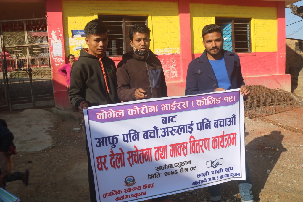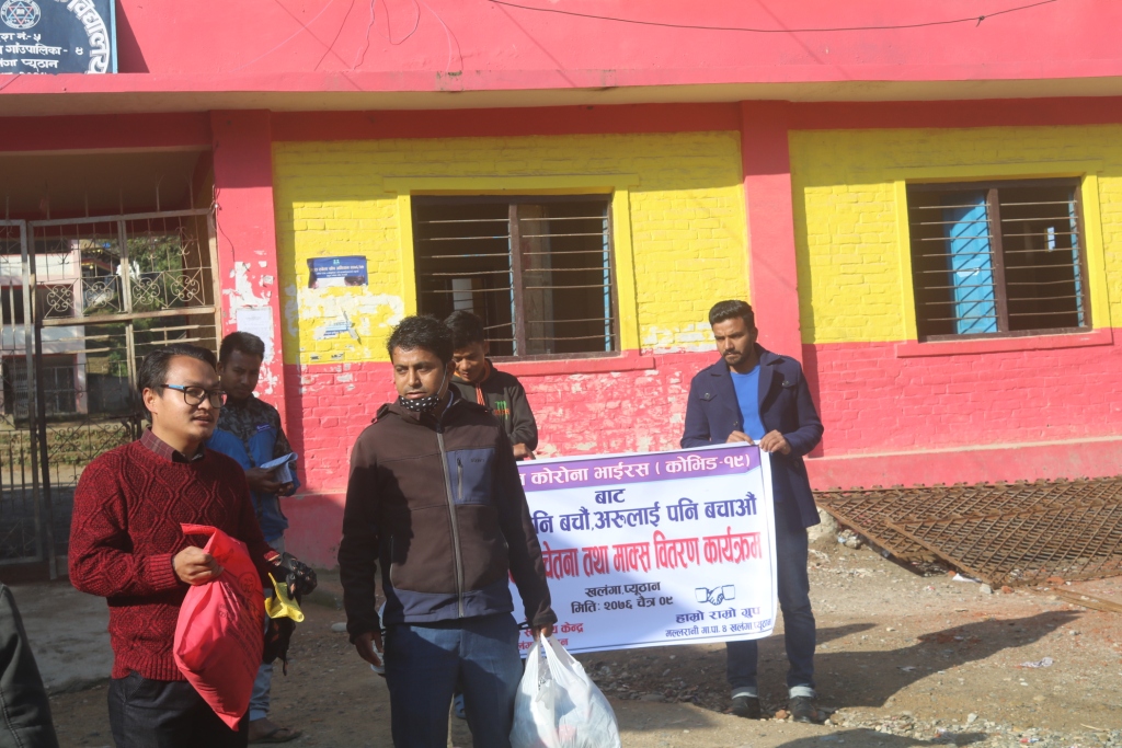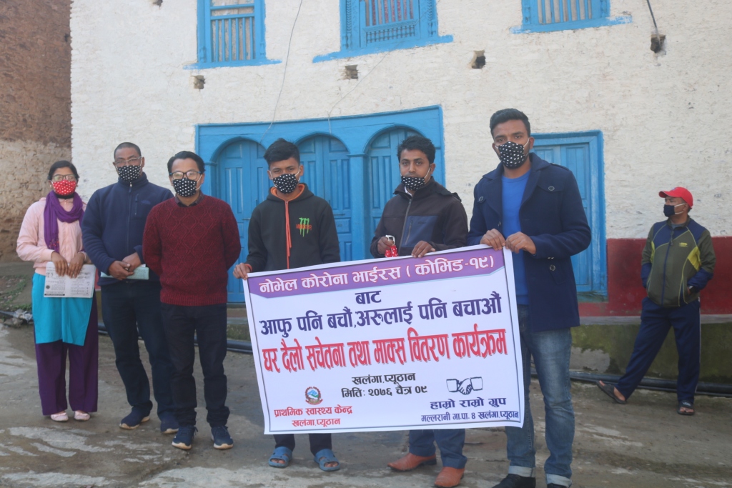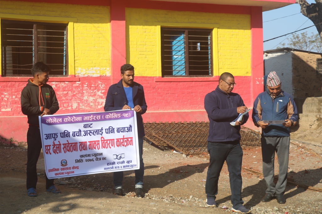 नोभेल कोरोना भाईरसको संक्रमणबाट बच्न प्यूठानको खलंगामा घरदैलो सचेतना तथा माक्स वितरण गरिएको छ । मल्लरानी गाउँपालिका, प्राथमिक स्वास्थ्य केन्द्र खलंगा र हाम्रो राम्रो ग्रुपले संयुक्त रुपमा आईतबार विहान यस्तो कार्यक्रम गरेका हुन् ।