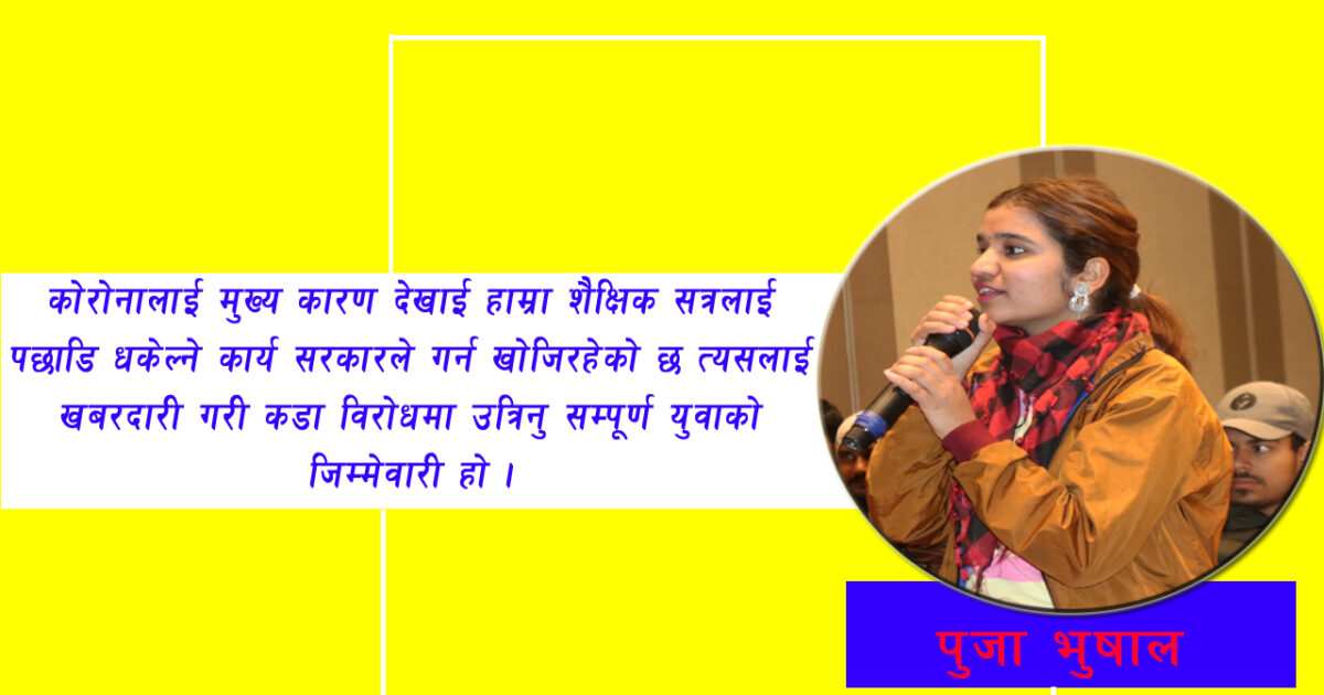 कोरोनालाई मुख्य कारण देखाई हाम्रा शैक्षिक सत्रलाई पछाडि धकेल्ने कार्य सरकारले गर्न खोजिरहेको छ त्यसलाई खबरदारी गरी कडा विरोधमा उत्रिनु सम्पूर्ण युवाको जिम्मेवारी हो । किनभने हामीलाई १ वर्ष पछाडि पार्न खोज्दा हामी धेरै पछाडि पर्ने सत्यलाई मनन् गरेर अगाडि बढ्न जरुरी छ । स्वास्थ्य संस्थाबाट बालबालिकहरुको चेकजाँच नगर्ने कार्य गर्ने हस्पिटलहरुका विरुद्ध कडा आन्दोलन युवाहरुले गर्नुपर्छ । हरेक क्षेत्रमा आउने समस्या समाधानका विकलल्पहरु खोज्ने कार्य युवाले नै गर्नुपर्दछ । हामी युवाहरुले नै बालबालिकाको शिक्षाका लागि आवाज उठाउने, विभिन्न सरोकारवाला पक्ष, तिनै तहका सरकार , अभिभावक , विद्यार्थी संघ संगठन , आइ.एन्.जिओ, एन्.जिओ लगायतका क्षेत्रहरुमा वहस र पैरवी गर्न जरुरी छ । विश्व मै लगभग ८० प्रतिशत मनिसहरु लकडाउनमा छन । घरमा बसिरहेका बालबालिकाहरुलाई विभिन्न र्सिजनशील कार्यमा लगाउन युवाहरु र अभिभावकको उत्तिकै गहन भूमिका हुन्छ ।