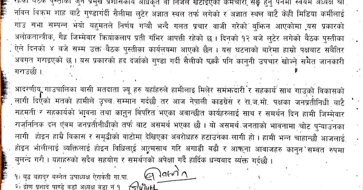 ‘सवैको समझदारी र सहकार्यका साथ गाउँको विकासका लागि दिएको मतको उच्च सम्मान गर्दछौं ।’, गाउँपालिकावासी मतदाताहरुलाई सम्बोधन गर्दै विज्ञप्तीमा भनिएको छ, ‘तर आज नेपाली कांग्रेस र रा.ज.मो. पक्षका जनप्रतिनिधिबाटै सहमति र सहकार्यको भावना तथा कानुन विपरित भएका अवान्छीत कार्यहरुलाई साथ र समर्थन दिन हामी जिम्मेवार राजनीतिक दल एवं जनप्रतिनिधिको तर्फबाट असमर्थ भएका छौं ।’