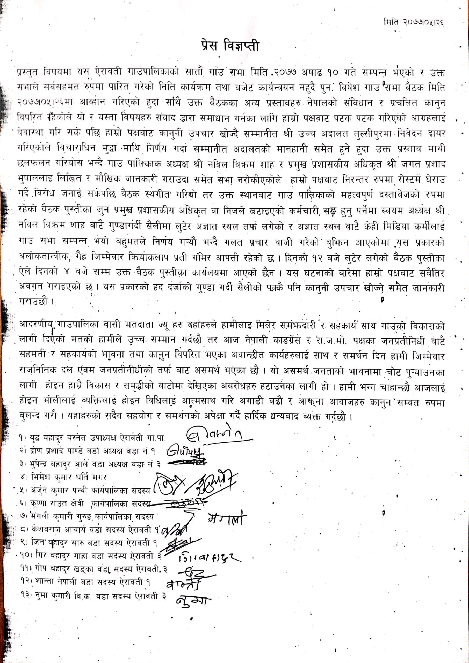 प्यूठान, २६ भाद्र । बहुमतका आधारमा ऐरावती गाउँपालिकाको विशेष गाउँसभा सम्पन्न भनिएको गाउँसभा अज्ञात स्थलबाट भएको भन्दै १३ जना गाउँसभा सदस्यहरुले प्रेस विज्ञप्ती मार्फत आपत्ति प्रकट गरेका छन् ।