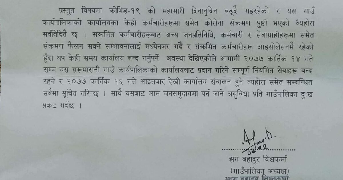 कात्तिक १४ गतेसम्मका लागि कार्यालय बन्द गरिएको गाउँपालिका अध्यक्ष झगबहादुर विश्वकर्माले बताउनुभयो ।
