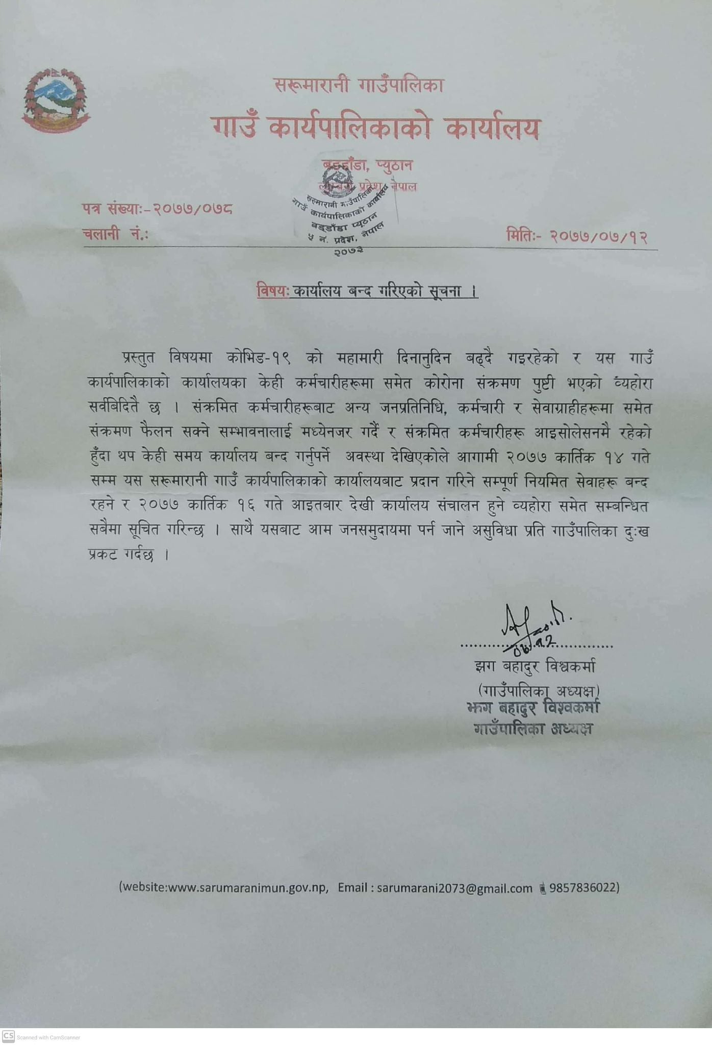 प्यूठान, १२ कात्तिक । सरुमारानी गाउँपालिकाको कार्यालयका कर्मचारीमा कोरोना पुष्टी भएपछि कार्यालयको सेवा बन्द भएको छ ।