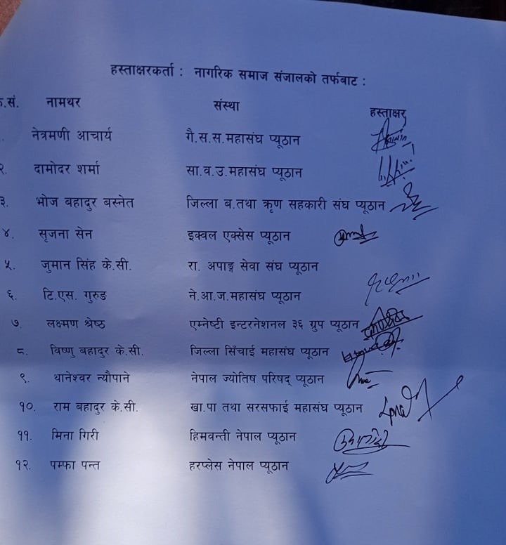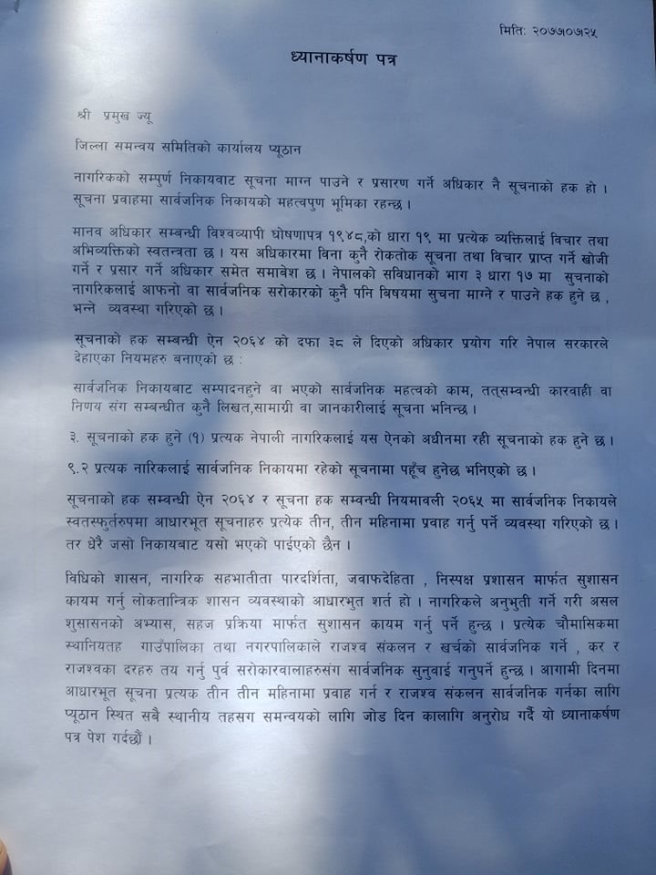जिल्लामा क्रियाशिल रहेको नागरिक समाजले जिल्ला समन्वय समितिको प्रमुख केशवराज आचार्यलाई उक्तपत्र बुझाएको हो । ध्यानकर्षण ग्रहण गर्दै आचार्यले सुचना प्रवाह सक्रियरुप गराउन स्थानियतह तथा अन्य कार्यालयलाई आग्रह गर्ने बताउनु भएको छ ।