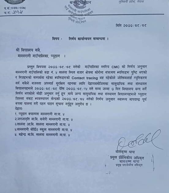 पालिका स्तरीय कोभिड संकट व्यवस्थापन केन्द्रको सोमबार बसेको बैठकले प्यूठान क्याम्पस, जनजागृति मावि, खलंगा आवि, मल्लरानी बोर्डिंग स्कुल र महेन्द्र मावि एक साताका लागि बन्द गर्ने निर्णय गरेको हो ।
