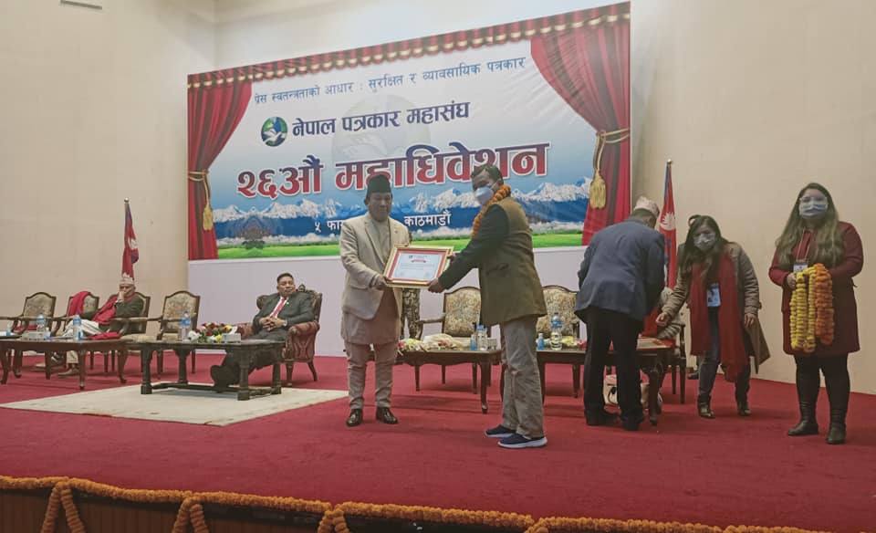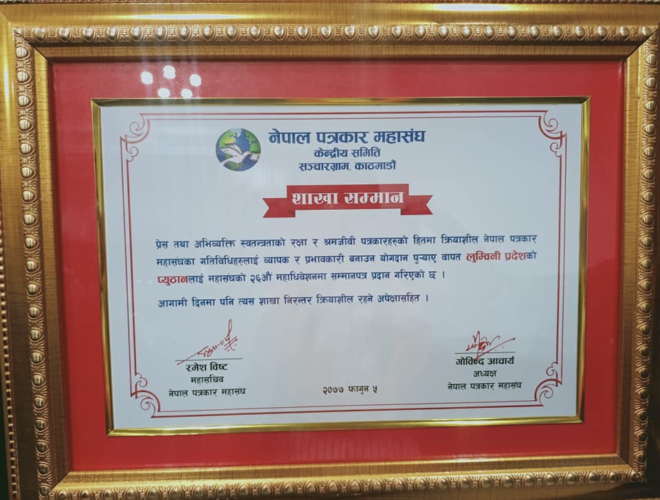 नेपाल पत्रकार महासंघ केन्द्रीय समितिको २६ औं महाधिवेशनमा प्यूठान शाखालाई सम्मान गरिएको हो ।