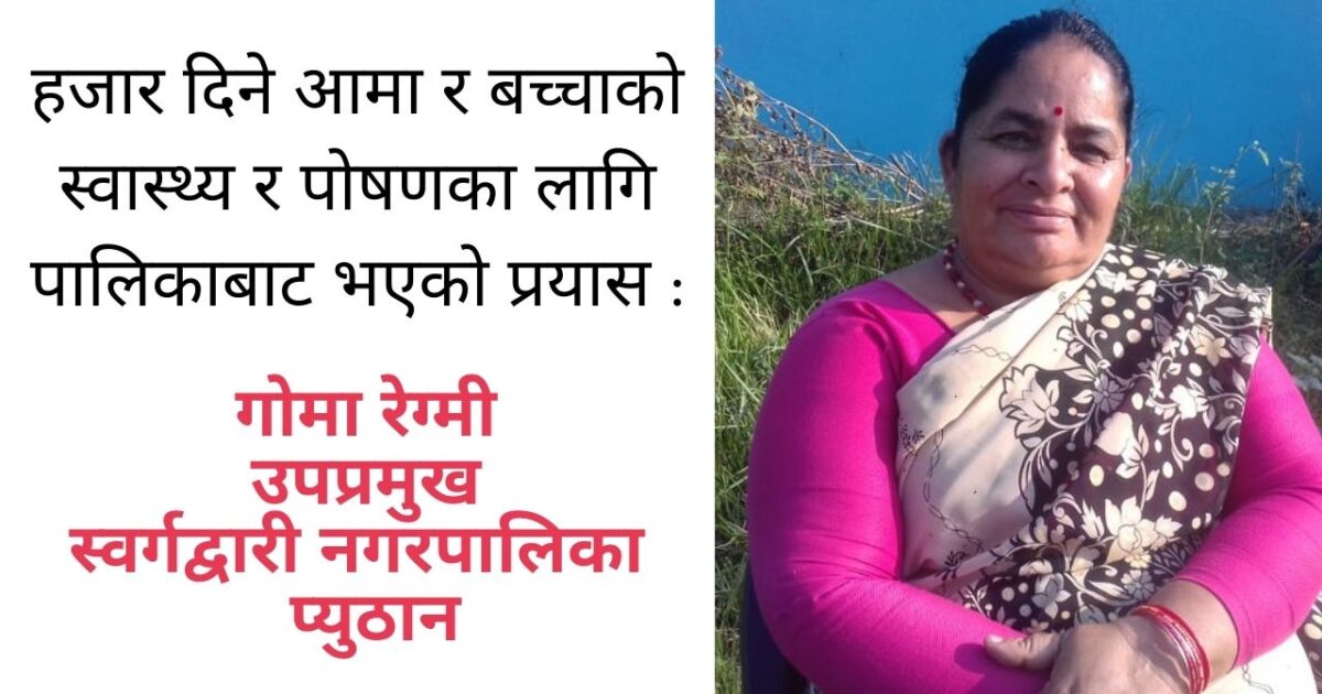 हाम्रो यस स्वर्गद्धारी नगरपालिकामा उपमेयर कोसेली कार्यक्रम हजार दिने आमा र बच्चाको सुरक्षाको लागि गरिएको छ । जसमा जिरो होम डेलिभरी गराउने एउटा लक्ष्य छ । स्वास्थ्य संस्थामा सुत्केरी हुने महिलाहरुलाई उपमेयर कोसेली कार्यक्रमबाट एउटा झोला त्यसमा हाइजेनिक सामाग्रीहरु छन् । अनि त्यसमा पौष्टिक खानेकुराहरु छन् । औषधीहरु सहित न्यानो झोल वितरण गर्छौ । र २८ सय रुपियाँ सरकारबाट पाउने रकममा एक हजार रुपियाँ उममेयर कोसेली कार्यक्रमबाट थप गरेर ३८ सय रुपियाँ सुत्केरी हुने व्यक्तिलाई दिने गरेका छौं ।