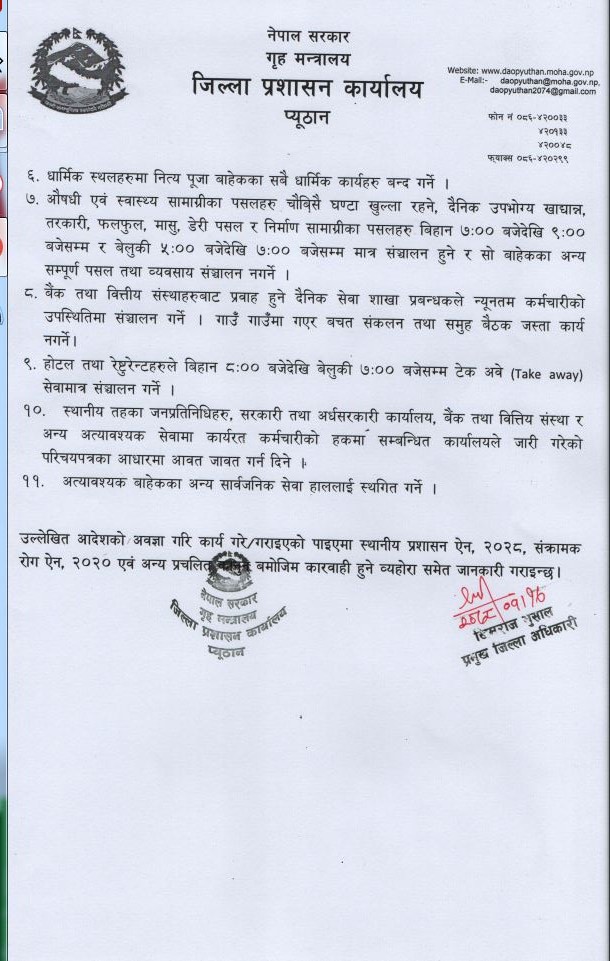 शनिबार विहान ६ बजेदेखि निर्णय कार्यान्वयनमा आउने प्रजिअ भुसालले बताउनुभयो । लकडाउनको समयमा अत्यावश्यक एम्बुलेन्स, दमकल, शवबाहान, खाद्य सामाग्री, पशुपन्छी, फलफुल, दुधडेरीका गाडी निरन्तर चल्नेछन् ।