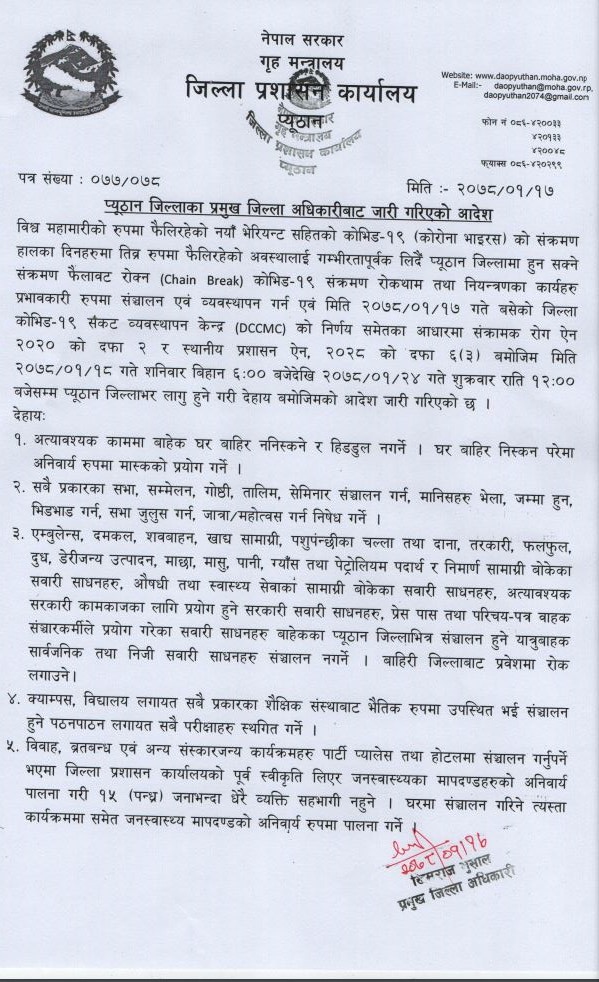 जिल्ला कोभिड–१९ संकट व्यवस्थापन केन्द्रले शनिबारदेखि एकसाताका लागि लकडाउन गर्ने निर्णय गरेको प्रमुख जिल्ला अधिकारी खिमराज भुसालले जानकारी दिनुभयो ।