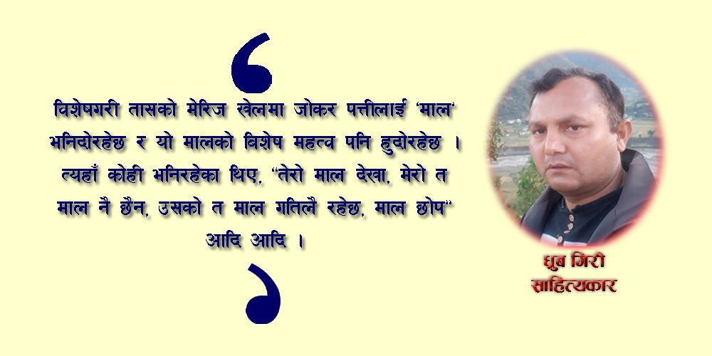 लक डाउनको सुरुका दिनको कुरा हो फुर्सद भएकाले केही गाऊका मानिसहरु मिलेर तास खेलिरहेका थिए । भाइ मिलन पनि नजिकै बसेर केही खेलिरहेको थियो । विशेषगरी तासको मेरिज खेलमा जोकर पत्तीलाई ‘माल’ भनिदोरहेछ र यो मालको बिशेष महत्व पनि हुदोरहेछ । त्यहाँ कोही भनिरहेका थिए, “तेरो माल देखा, मेरो त माल नै छैन, उसको त माल गतिलै रहेछ, माल छोप, आ िद आदि।’’