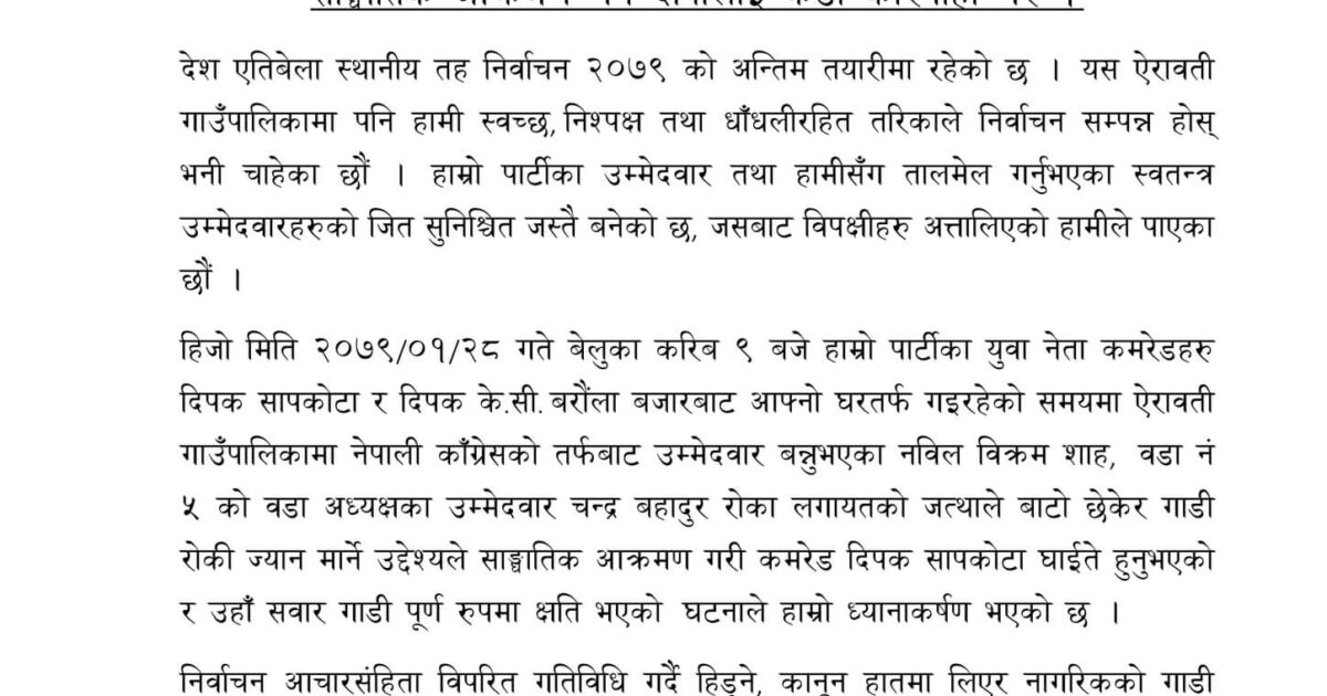 प्यूठान । आफ्ना दुई जना युवा कार्यकर्तालाई नेपाली कांग्रेसका उम्मेदवार सहितका टोलीले आक्रमण गरेको नेकपा माओवादी केन्द्र ऐरावती गाउँपालिका संगठन समितिले जनाएको छ ।