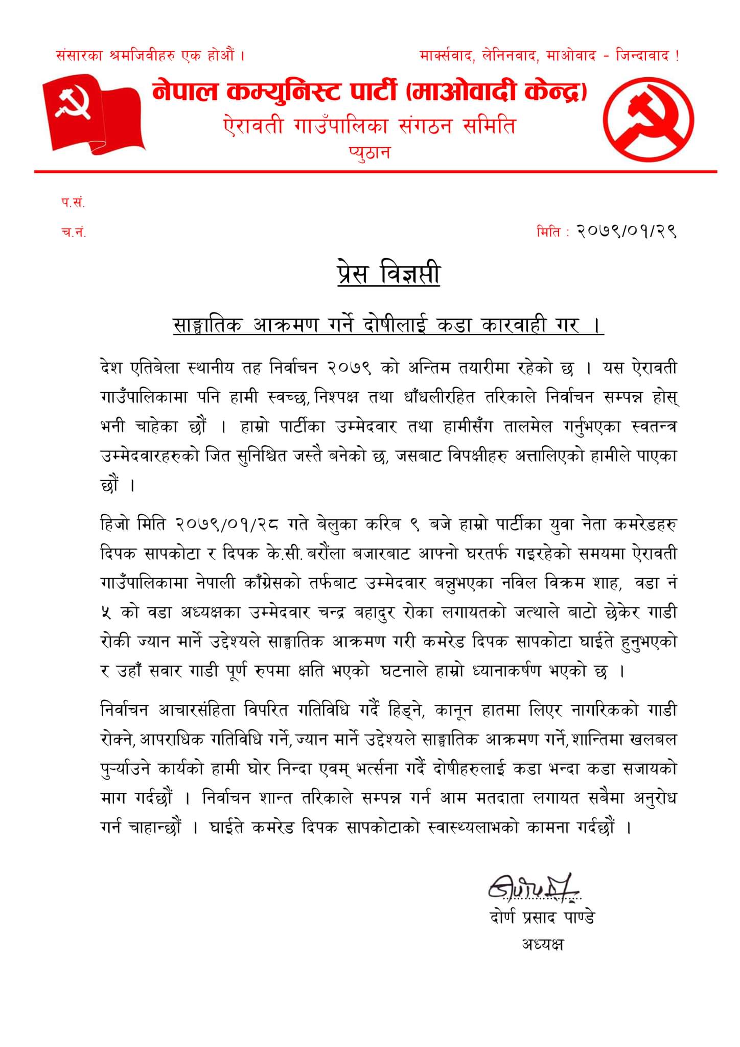 पालिका अध्यक्षका उम्मेदवार नविल विक्रम शाह, वडा नं. ५ का वडा अध्यक्षका उम्मेदवार चन्द्र बहादुर रोका लगायतको टोलीले माओवादीका युवा दिपक सापकोटा र दिपक केसीमाथी आक्रमण गरेको माओवादीले जनाएको छ ।