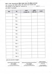 हामीले भारत तथा तेश्रो मुलुकबाट आएकाहरुसँग सम्झौता गरेका छौं । स्वास्थ्य मन्त्रालयले पठाएको फम्र्याटमा परिवारका सदस्यसँग समेत टाढा हुने गरी होम क्वारेन्टाईनमा बस्न सम्झौता गरेका हौं । उनीहरुसँग स्वास्थ्यकर्मीले नियमित भेटघाट गर्ने र स्वास्थ्य अवस्था बारे जानकारी लिने गर्नुभएको छ । हामीसँग दुई वटा ‘गन थर्ममिटर’, ५० सेट प्लाष्टिक र कपडाको स्थानीय स्तरमै निर्माण गरेको व्यक्तिगत सुरक्षा सामाग्री (पिपिई), १० सेट विश्व स्वास्थ्य संगठनको मापदण्ड अनुसारको पिपिई र स्वास्थ्य कार्यालय मार्फत प्राप्त ३ सेट पिपिई छन् । यिनै सुरक्षा सामाग्रीको प्रयोग गरि स्वास्थ्य अवस्थाबारे जानकारी लिने, विरामी भएकालाई औषधी उपचार गर्ने गरेका छौं । जोखिमपूर्ण केसहरु अहिले छैनन् ।