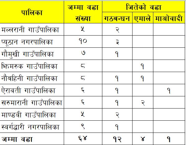 प्यूठान । जिल्लाका ६४ वडामध्ये हालसम्म १७ वटा वडाको मतगणना सकिएको छ । हालसम्मको मत परिणाम अनुसार गठबन्धनले १२ वटा वडामा जित हासिल गरेको छ ।
