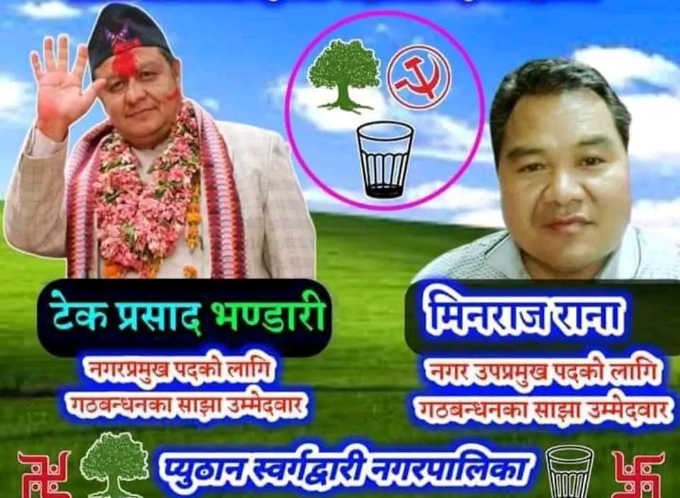 प्युठान । स्वर्गद्वारी नगरपालिकाको प्रमुखमा टेक प्रसाद भण्डारी र उप प्रमुखमा मिनराज पुन बिजयी हुनुभएको छ ।
