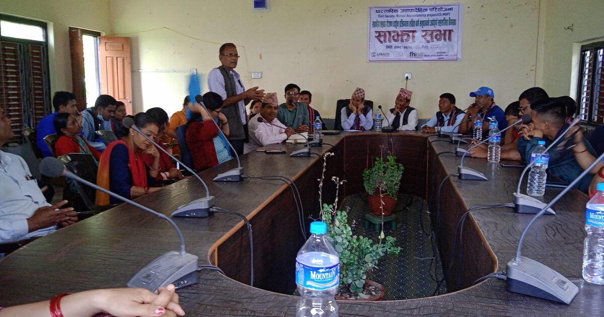 जिल्ला स्तरीय नागरिक समाज सञ्जालको आयोजनामा आज खलंगामा भएको स्थानीय तहका योजना तर्जुमा प्रक्रियामा लक्षित वर्ग समुदायको अर्थपूणर् सहभागिता विषयक साझा सभामा यी विषयमा चर्चा गरिएको हो । युएसएआइडी र एफएचआई ३६० को साझेदारिमा सञ्चालित पारस्परिक जवाफदेहिता परियोजना अन्र्तगत कार्यक्रम गरिएको हो ।