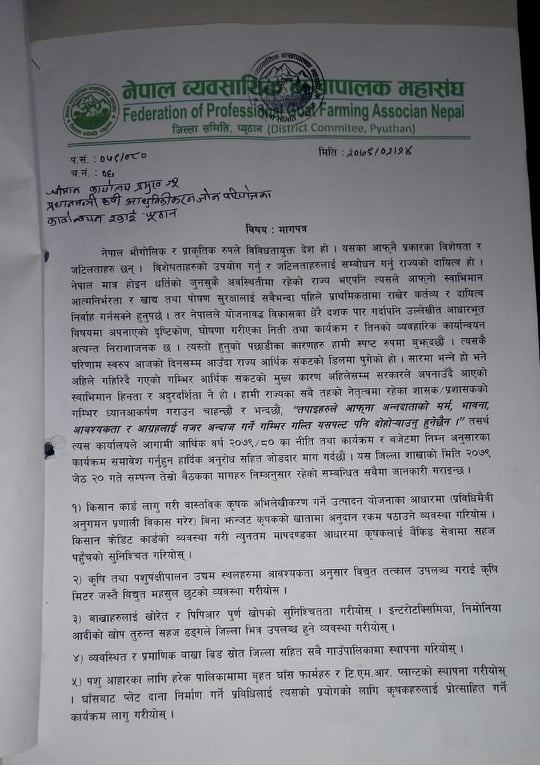 प्यूठान । जिल्लाका बाख्रापालक किसानले व्यवसाय प्रर्वद्धनका लागि जिल्लाका सरोकारवाला निकायसमक्ष १८ बुँदे मागपत्र पेश गरेका छन् । जिल्लाका स्थानीय तह र बाख्रापालन व्यवसायसँग सरोकार राख्ने निकायलाई मागपत्र पेश गरेको हो ।