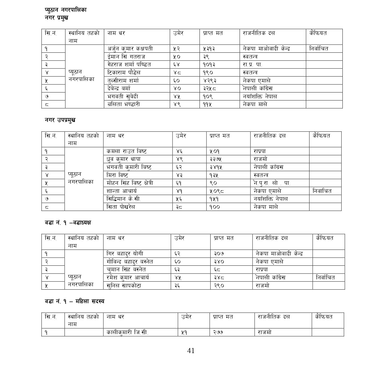 प्यूठान नगरपालिकामा ०७४ को निर्वाचन परिणाम (विस्तृत विवरण सहित)