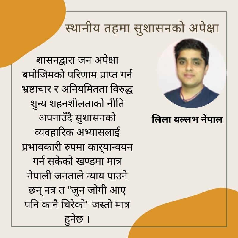 लिला बल्लभ नेपाल नेपालको संविधानले गाउँगाउँमा सिंहदरवार पुर्‍याउने मूल अभियानलाई आत्मसात गरेको परिपेक्षमा संघ, प्रदेश र स्थानीय तहको निर्वाचन भई …